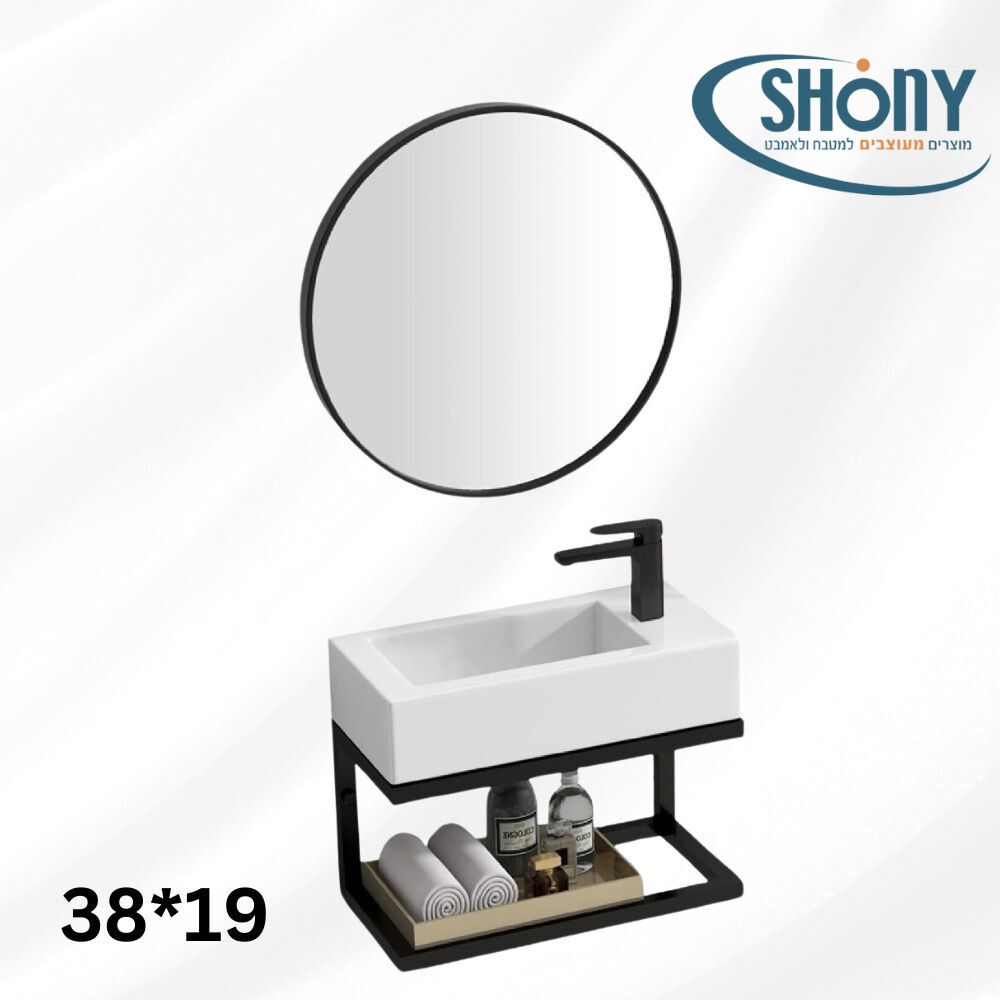 הסט כולל: כיור רחצה חרס 19*38, מדף מתכת, מראה עגולה